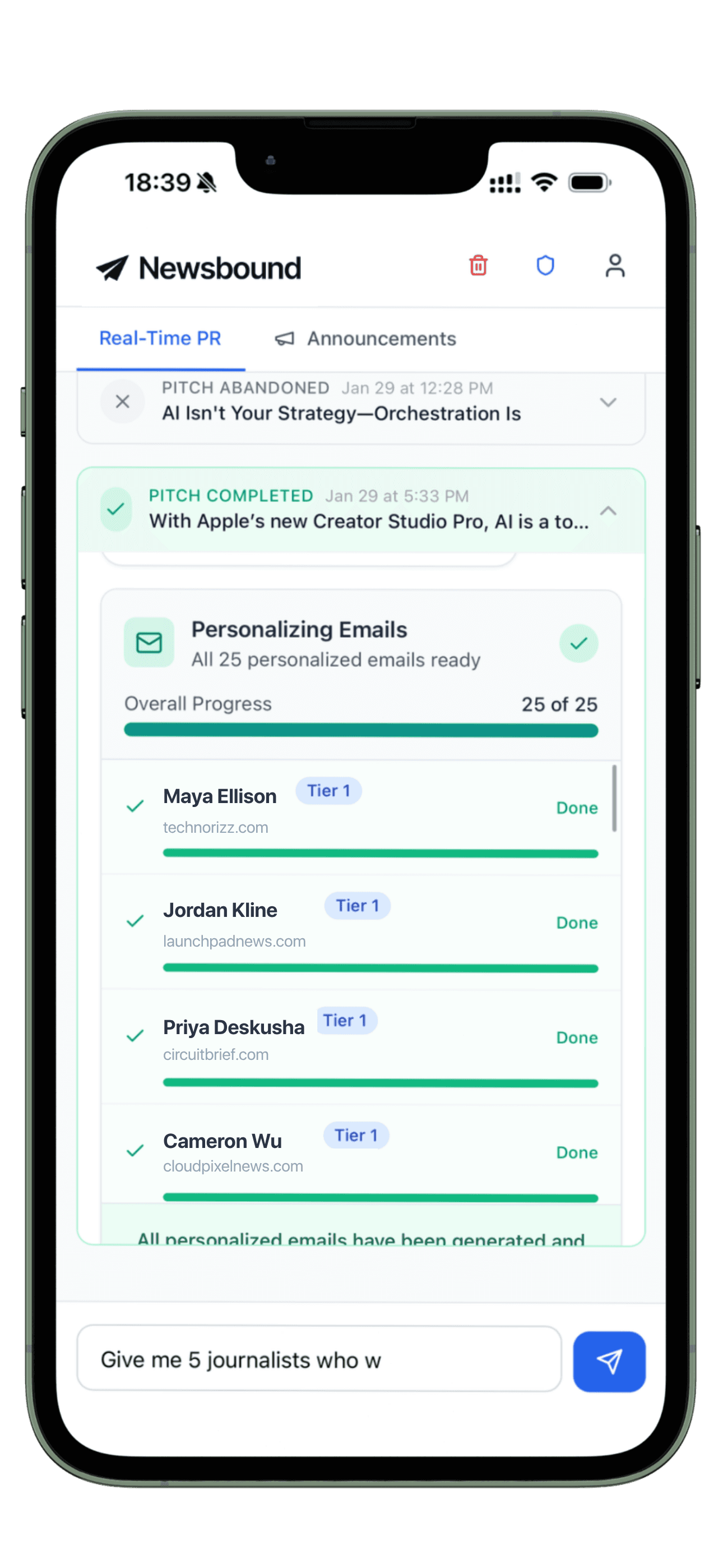 Newsbound takes your milestones, launches, and updates and crafts targeted pitches that get them in front of the right journalists and publications